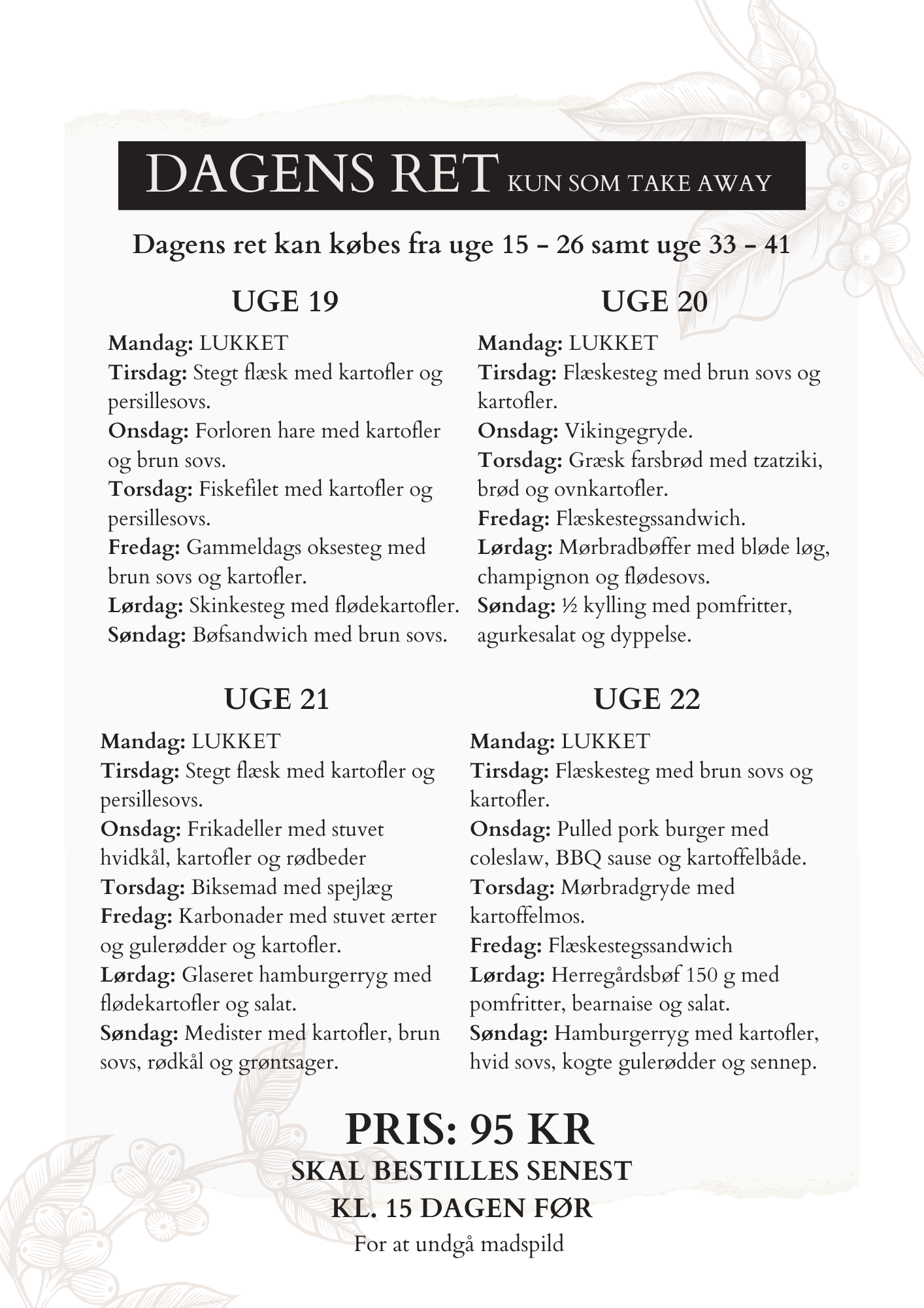I perioden fra uge 15 til uge 26 samt fra uge 33 til uge 41 tilbyder vi dagens ret som take away til 95 kr. pr. person.