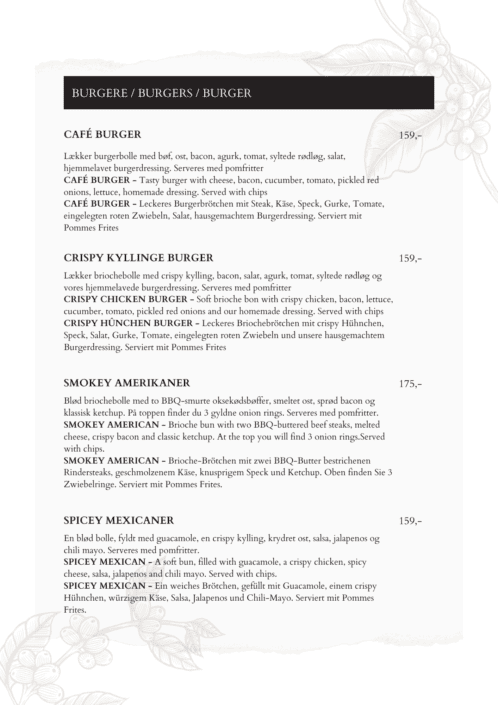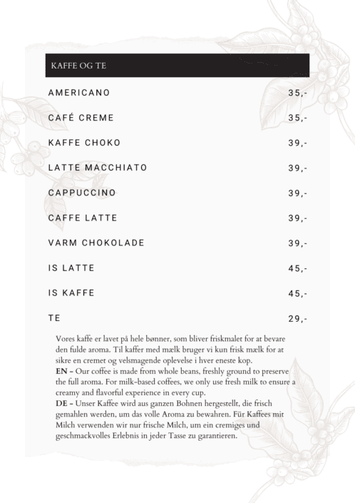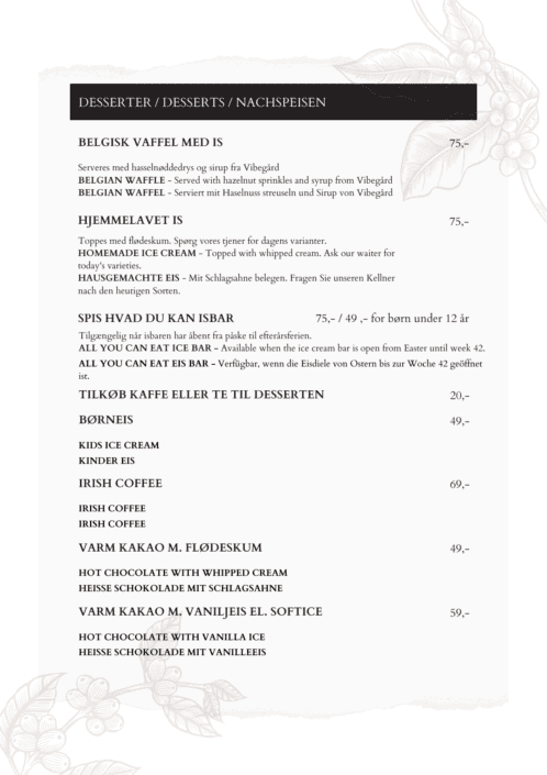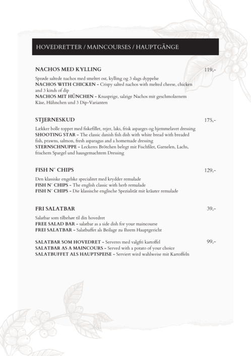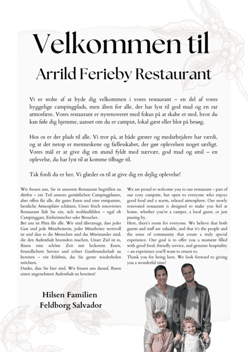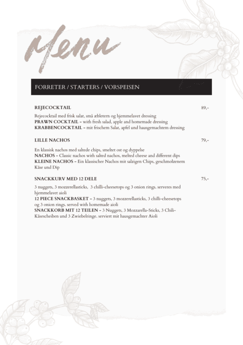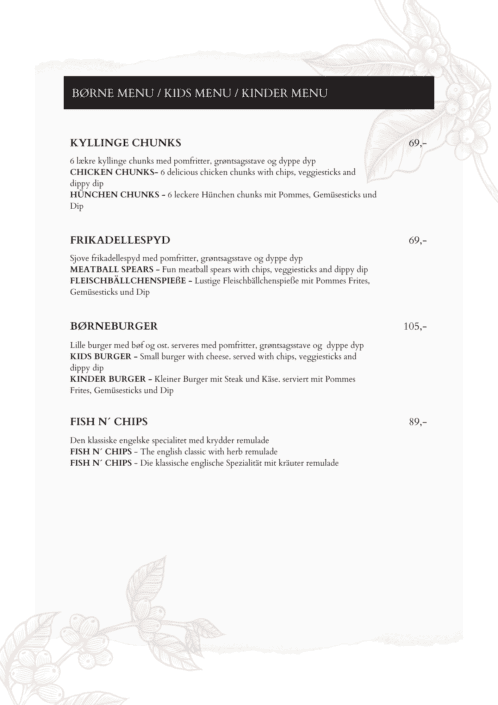 Træd ind i vores verden af kulinariske fristelser og opdag et menukort fyldt med delikate og spændende retter, skabt til at tilfredsstille enhver smag og alderstrin.