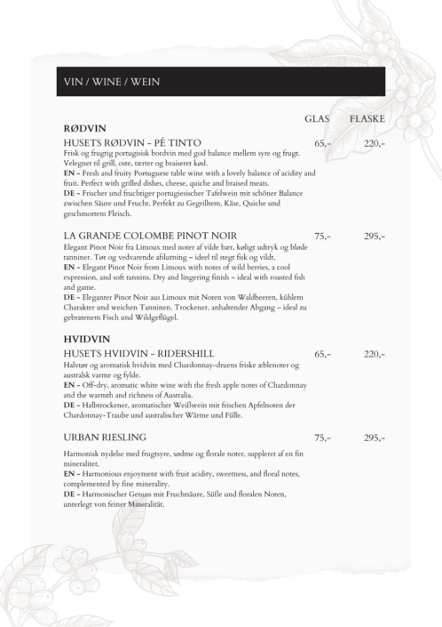 Uanset om du er ung eller gammel, lover vores menu at vække dine sanser og efterlade dig med en smagfuld oplevelse, der vil sætte gang i samtalen og skabe uforglemmelige minder. Velbekomme!